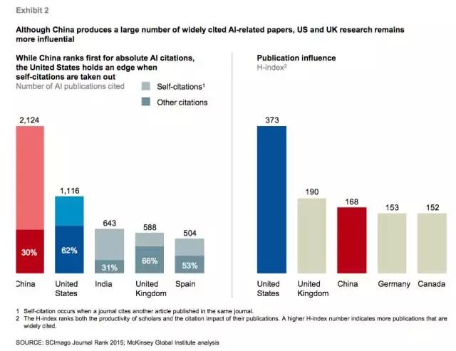 表2:左圖按AI相關(guān)的論文數(shù)量排名,右圖按 H-index 排名。雖然中國發(fā)表了大量被廣泛引用的 AI 相關(guān)的論文,但論影響力仍是美英更大。中國在絕對引用方面排名第一,但去除自引(self-citation)后,美國更有優(yōu)勢。