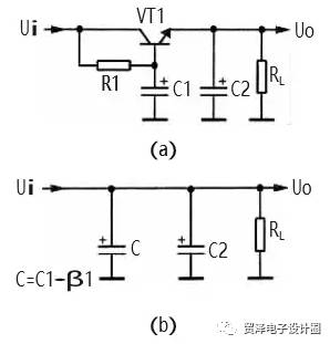 ①電路中的 VT1、 R1、 C1 組成電 子濾波器電路,這 一電路相當(dāng)于一 只容量為 C1×β1 大小電容器,β1 為 VT1 的電流放 大倍數(shù),而晶體管 的電流放大倍數(shù) 比較大,所以等效 電容量很大,可見 電子濾波器的濾 波性能是很好的。等效電路如圖 6(b)所示。圖中 C 為 等效電容。