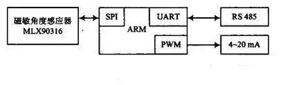 數(shù)據(jù)處理單元由磁敏角度感應(yīng)器、微處理器單元、通信接口以及輸出模塊,具體的功能框如圖所示。