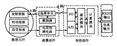 由敏感元件、測量電路、智能部件與接口部件構(gòu)成,敏感元件的結(jié)構(gòu)所示如圖1,測量部件由選擇單元、激勵源和電荷檢測單元組成;智能部件由I/O單元、A/D單元、濾波單元、角度計(jì)算單元等組成;接口部件由電流輸出單元、RS232通訊單元等組成。