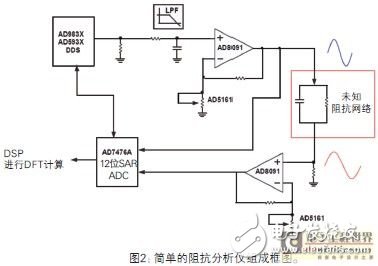 阻抗譜大大簡化了人體皮膚這類復數(shù)阻抗的精確分析,該方法充分考慮了電阻、電容和電感的阻抗隨頻率的改變而不同變化的因素。隨著頻率的增加,電阻器的阻抗保持不變,電容器的阻抗減小,而電感的阻抗增加。通過用已知交流波形激勵測試阻抗,能夠確定未知阻抗的電阻、電感和電容分量。直接數(shù)字頻率合成器(DDS)具有靈活的相位頻率和振幅、掃描功能以及可編程能力,是激勵未知阻抗的理想選擇。通過嵌入的數(shù)字處理和增強的頻率控制功能,該設備產(chǎn)生合成的模擬或數(shù)字頻率步進波形。圖2顯示了一個簡單阻抗分析儀組成方框圖。低功耗、75MHz DDS的AD9834所產(chǎn)生的交流波形被高速、軌至軌運算放大器AD8091濾波、緩沖以及幅值調整。另一個AD8091對響應信號進行緩沖并對其幅值進行調整,以與12位的1Msps逐次逼近型(SAR)模數(shù)轉換器AD7476A的輸入電壓范圍相匹配。