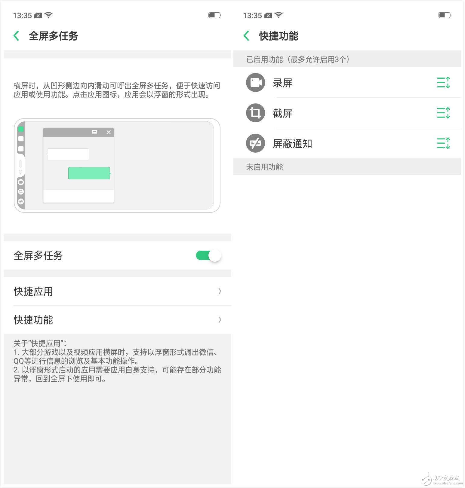 全屏多任務(wù)比較有意思,它指的是手機在橫屏模式下,在屏幕“齊劉?!鄙舷聝蓧K的“兔耳朵”區(qū)域顯示 3 個常用 app 和 3 個常用操作(默認是錄屏、截屏、屏蔽橫屏通知),在游戲時比較實用。