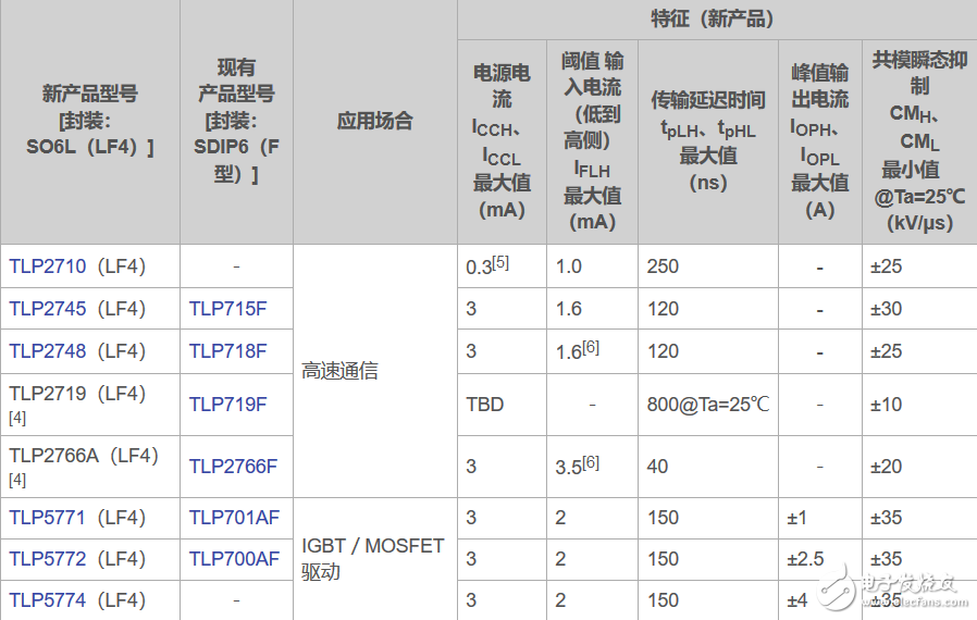 目前為止,東芝已推出8款采用SO6L(LF4)封裝的光電耦合器:其中3款用于高速通信應(yīng)用,5款用于IGBTMOSFET驅(qū)動(dòng)應(yīng)用?,F(xiàn)在,東芝又新增6款采用SO6L(LF4)封裝的光電耦合器,以擴(kuò)大其產(chǎn)品陣容:其中3款用于高速通信應(yīng)用,3款用于IGBT/MOSFET驅(qū)動(dòng)應(yīng)用。