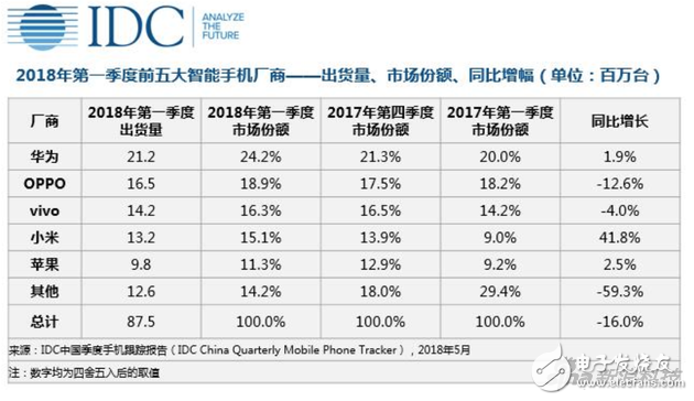 今天,國際知名調(diào)研機構(gòu)IDC發(fā)布了2018年第一季度中國智能手機市場調(diào)研報告。報告顯示,本季度中國智能手機市場出總貨量8750萬部,同比下降約為16.0%,低于去年同期水平。前五大廠商優(yōu)勢繼續(xù)擴大,其他廠商加速下滑,降幅接近六成。