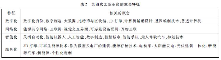 由于此次新工業(yè)革命仍處于孕育期,對(duì)其方向有著不同的解讀,新的概念、新的技術(shù)層出不窮,國(guó)內(nèi)學(xué)者在借鑒外國(guó)學(xué)者研究的基礎(chǔ)上,也做了諸多有益的探索,提出了不同的概念和新的技術(shù),詳見表1。為從各種紛繁復(fù)雜的概念中提煉第四次工業(yè)革命的核心要素,我們借鑒社會(huì)科學(xué)研究中的質(zhì)性研究方法,通過對(duì)第四次工業(yè)革命的典型文本分析,對(duì)各種概念進(jìn)行重新編碼、歸類,將現(xiàn)有的有關(guān)新工業(yè)革命的概念、所涉及的技術(shù)合并成四類:(1)與數(shù)字化相關(guān);(2)與網(wǎng)絡(luò)化有關(guān);(3)與智能化相關(guān);(4)與綠色化相關(guān)(參見表2)。易言之,第四次工業(yè)革命是一次聚合了數(shù)字化、網(wǎng)絡(luò)化、智能化和綠色化四大趨勢(shì)的破壞式技術(shù)創(chuàng)新⑤。