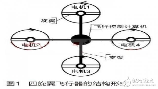 四旋翼飛行器由一個十字支架和四個螺旋槳組成,支架中間安放飛行控制處理器及外部設(shè)備,四個螺旋槳半徑和角度相同,呈左、右、前、后四個方向兩兩對稱排列。四個電機對稱安裝在支架端,其中,電機1和電機3逆時針旋轉(zhuǎn),電機2和電機4順時針旋轉(zhuǎn),通過改變四個電機的轉(zhuǎn)速來控制電機的運行狀態(tài)。其結(jié)構(gòu)形式如圖1所示。