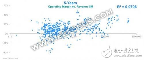 但是Wally認(rèn)為,這種分析太過(guò)于簡(jiǎn)化,不能代表真正的情形,他有很多數(shù)據(jù)支持這個(gè)觀點(diǎn)?,F(xiàn)在雖然已經(jīng)發(fā)生多次合并,但是其中表現(xiàn)最好的并不是在所有市場(chǎng)上贏家通吃,而是在非常有針對(duì)性的細(xì)分市場(chǎng)上的贏家通吃。他稱之為專業(yè)化而非整合。他列舉了TI的例子,之前的TI業(yè)務(wù)橫跨無(wú)線/蜂窩、汽車、ASCI和模擬器件,現(xiàn)在公司業(yè)務(wù)聚焦在模擬器件上,恩智浦也是如此,只專注于汽車和安全業(yè)務(wù)。還有一個(gè)典型的例子是安華高/LSI/博通,經(jīng)過(guò)多次整合之后,博通主要業(yè)務(wù)集中在有線和無(wú)線基礎(chǔ)設(shè)施以及企業(yè)數(shù)據(jù)中心(尤其是存儲(chǔ))上。值得注意的是,TI和博通的盈利能力穩(wěn)步攀升,利潤(rùn)率(營(yíng)業(yè)利潤(rùn)占營(yíng)收的百分比)已經(jīng)達(dá)到40%,恩智浦達(dá)到20%。相比之下,英特爾多年來(lái)收購(gòu)并剝離了許多公司的業(yè)務(wù),它的利潤(rùn)率卻基本上保持不變。