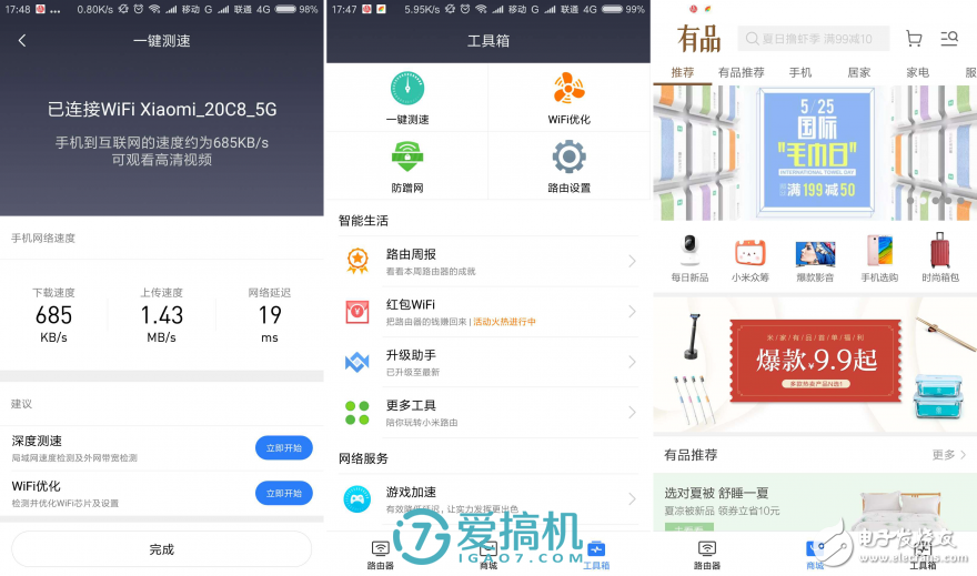 雖然小米路由器 4 在固件上的選擇較少,但自帶的各類功能插件基本也能滿足用戶的需求了。像是網(wǎng)速測試、WiFi 優(yōu)化、紅包 WiFi、游戲加速、防止蹭網(wǎng)等都是一應(yīng)俱全,用戶只需要在 app 中下載對(duì)應(yīng)的插件安裝即可,更方便一般的小白用戶。而作為小米自家的 app,還內(nèi)置了有品商場的快捷方式,方便隨時(shí)剁個(gè)手。