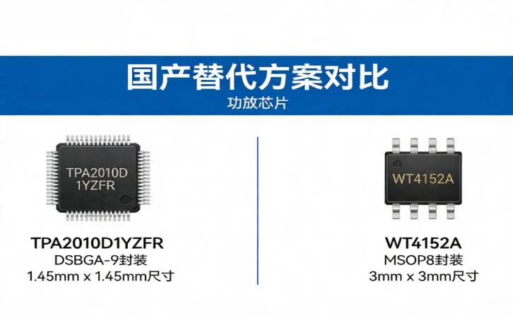 這是兩款芯片最根本的區(qū)別。TPA2010D1YZFR的DSBGA-9封裝只有1.45mm x 1.45mm,是專門為手機(jī)內(nèi)部PCB設(shè)計(jì)的超小封裝。WT4152A是MSOP8,3mm x 3mm,面積約是DSBGA-9的4倍。
