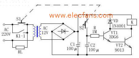 電路如下圖所示。工作時,按下S1、S2后,整流電源對C2充電,C2兩端的電壓迅速達到電源電壓值。同時,電源經R為V1、V2組成的復合管提供基極偏流,使復合管導通,繼電器K吸合,其觸點K1-1閉合與S1一起為電器RL提供交流電源,S1、S2松開時RL仍能正常工作;但S1、S2松開后,電容C2經R、復合管放電,使復合管保持導通狀態(tài),以維持RL的正常工作;隨著時間的延遲,C2上的電壓不足以維持復合管的導通,K便釋放,電器RL上的電源就被自動切斷,從而達到了自動關機的目的。延時時間的長短由C2和R的時間常數決定,改變C2或R的數值可以改變延時時間的長短(按圖中數值延時約7分鐘),加大C2或R的數值,延時時間變長,反之時間變短。