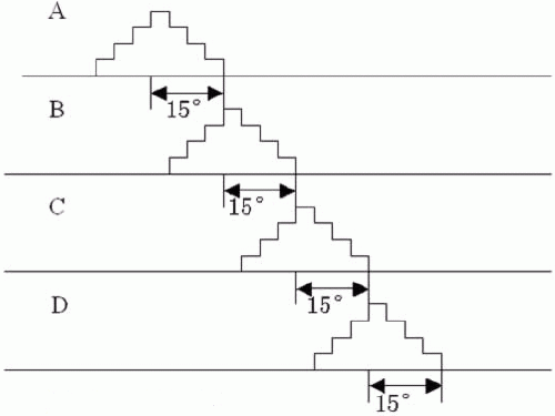 (8/6)四相SRM轉(zhuǎn)子極距角(周期)為60度,每相步進角為15度,因此微分驅(qū)動的行為即是要細(xì)分該15度的步進角,在15度的步進角中找到三個轉(zhuǎn)矩平衡位置,由于SRM繞組電流的大小受PWM功率變換器控制,所以調(diào)節(jié)PWM輸出脈寬即可使實際輸出電流如圖2所示按階梯波電流變化,各相通電順序為: