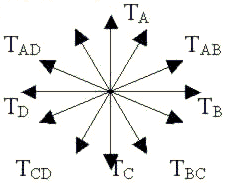 ??? 對于(8/6)四相SR電動機而言,A相繞組產(chǎn)生的穩(wěn)定零位和B相繞組產(chǎn)生的穩(wěn)定零位錯開一個步進角,在空間按幾何角度15度,若用電角度表示90度。如規(guī)定轉(zhuǎn)子順時針方向旋轉(zhuǎn)為正轉(zhuǎn),則只要按A-B-C-D的順序依次給各相繞組供電,開關(guān)磁阻電動機的轉(zhuǎn)子以步進角15度一步一步的正轉(zhuǎn)。假定忽略電動機的互感,允許將轉(zhuǎn)矩進行矢量相加,即得到圖1所示的旋轉(zhuǎn)磁場轉(zhuǎn)矩矢量,其中TAB 、TBC、TCA和TAD稱為派生轉(zhuǎn)矩矢量,表示兩相同時供電的合成轉(zhuǎn)矩;TA、TB、TC、TD稱為基本轉(zhuǎn)矩矢量,他們相位取決于定子磁極中心線的空間位置,表示一相單獨供電時的轉(zhuǎn)矩,相臨兩個轉(zhuǎn)矩錯開步進角3.75度。派生轉(zhuǎn)矩和基本轉(zhuǎn)矩的關(guān)系可表示為下列向量形式: