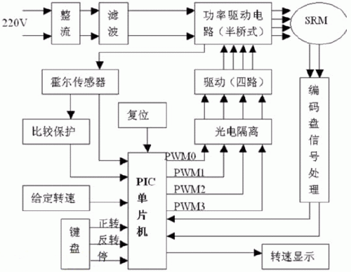 本文論述的微分驅(qū)動SRM的控制策略在具體實施階段,選用了Microchip公司的PIC18F2331高檔八位單片機,該芯片內(nèi)部集成了豐富的外設(shè)資源,其中功率控制PWM模塊、CCP模塊、A/D模塊、光電編碼器接口(QEI)等為SRM的控制提供了方便。