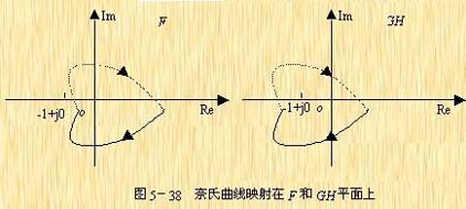 因而映射曲線 對其坐標原點的圍繞相當于開環(huán)頻率特征曲線 對GH平面上的(-1,j0)點的圍繞,圖5-38示出了奈氏曲線映射在這兩個平面上的位置。
