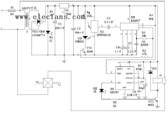 自動洗手器電路圖:如圖1所示。220V交流電路經(jīng)變壓器T降壓,變?yōu)榈蛪航涣麟?,?jīng)整流濾波,成為低壓直流,再經(jīng)三端集成穩(wěn)壓電路7806穩(wěn)壓,得到6V直流電供給控制電路工作。H1為紅色發(fā)光二極管,作為電源指示。N2為紅外接收電路SFH506-38,N3為鎖相環(huán)音頻譯碼器LM567,N3與R3、C6組成振蕩器,R3、R6決定N3內(nèi)部壓控振蕩器的中心頻率,LM567的3腳為信號輸入端,8腳為邏輯輸出端,其輸出端為OC門輸出,最大灌電流為100mA,LM567的工作電壓為4.75V~9V,工作頻率可從零點幾赫茲到500千赫,靜態(tài)工作電流為8mA。N4為NE555定時器,它與外圍元件組成單穩(wěn)態(tài)定時電路,其目的是在人手偶爾偏離了紅外線的探測范圍時,能保證洗手器的正常出水。