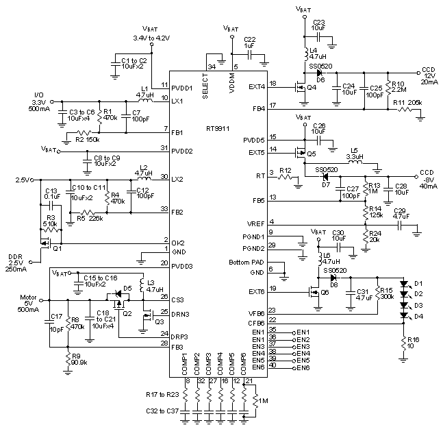 The RT9911 is a complete power-supply solution for digitalstill cameras and other hand-held