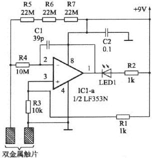 ??? 圖4所示的電阻橋觸摸開(kāi)關(guān)和圖3的不同之處,主要是采用了運(yùn)算放大器LF353N,而不是電壓比較器。LF353N是雙運(yùn)算放大器,該電路也只應(yīng)用了其中的一個(gè)。觸摸雙金屬片時(shí),LF353N的第1腳輸出低電平信號(hào),使發(fā)光二極管LED1導(dǎo)通發(fā)光。