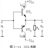 OCL電路稱為無輸出電容直接耦合的功放電路。如圖3-13所示。圖中VT1為NPN型晶體管,VT2為PNP型晶體管,當(dāng)輸入正弦信號ui為正半周時,VT1的發(fā)射結(jié)為正向偏置,VT2的發(fā)射結(jié)為反向偏置,于是VT1管導(dǎo)通,VT2管截止。此時的ic1≈ie1流過負(fù)載RL。當(dāng)輸入信號ui為負(fù)半周時,VT1管為反向偏置,VT2為正向偏置,VT1管截止,VT2管導(dǎo)通,此時有電流ic2通過負(fù)載RL。