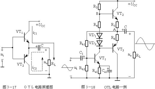 圖3-18是一例常見的OTL電路。圖中R3是晶體管VT1的集電極負(fù)載電阻。R4、VD1、VD2用來使三極管VT2、VT3建立一個偏置電壓,以減小交越失真。??