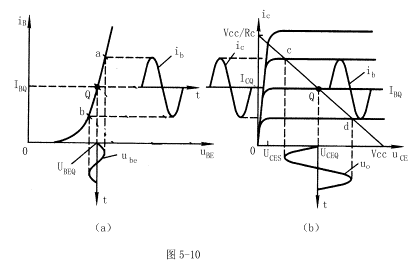 圖5-10(a)給出了三極管的輸入特性曲線和輸入信號的波形,圖5-10(b)為三極管的輸出特性曲線和輸出信號的波形。