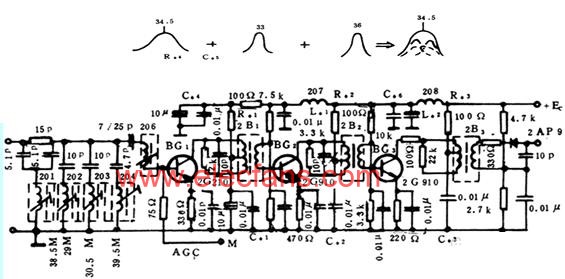 9 集成中放電路通常采用三級具有恒流源、直接耦合、寬通帶的差動放大器。由于集成中放電路本身沒有諧振電路,因此采用聲面波濾波器,以獲得集成中頻放大器所需要的頻率特性。