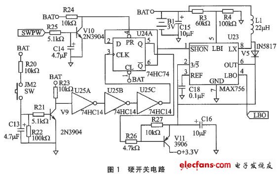 硬開關(guān)電路是將2節(jié)7號電池的串聯(lián)電壓通過DC/DC轉(zhuǎn)換器MAX756轉(zhuǎn)換成3.3 V的電壓,電路圖如圖1所示。如果不經(jīng)升壓電路而直接由電池供電,那么因電池端產(chǎn)生的電壓存在一個(gè)由高到低的下降過程。2節(jié)新電池的串聯(lián)電壓在3 V以上,隨著能量的耗盡,會(huì)下降到2V以下,導(dǎo)致機(jī)器無法正常工作。JM2按鍵為開/關(guān)機(jī)鍵,在按動(dòng)JM2時(shí),由于按鍵的抖動(dòng),會(huì)產(chǎn)生誤動(dòng)作。由R20, C13, R21,R22, R23, V9構(gòu)成的充放電回路,作用是通過適當(dāng)?shù)剡x擇R20,C13,R21的值,使充放電回路的充電時(shí)間與放電時(shí)間都大于鍵抖動(dòng)時(shí)間,從而有效地消除鍵的抖動(dòng)。 V9集電極輸出的按鍵脈沖經(jīng)去抖后,再通過U25 (74HC14)三個(gè)帶施密特觸發(fā)器的反相器進(jìn)一步濾波整形,產(chǎn)生波形完整的單脈沖。由該脈沖觸發(fā)U24A(74HC74 D觸發(fā)器)的翻轉(zhuǎn)。