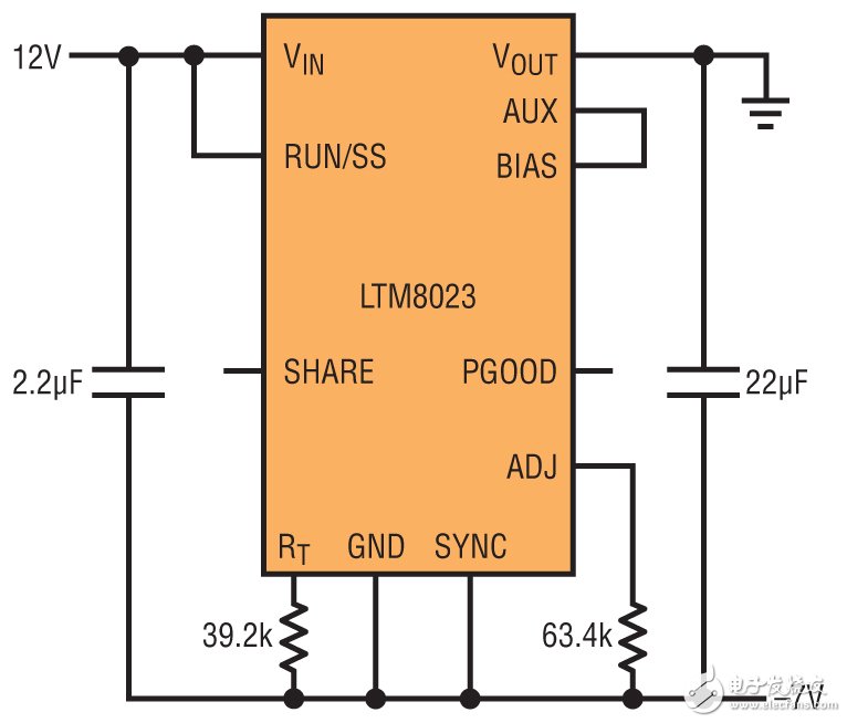 圖 2a 和 2b: LTM8023 原理圖,12VIN 至 -7VOUT/1A,以不到 30mVpp 的輸出紋波工作,最大限度地減少了注入 CMOS 傳感器和信號(hào)調(diào)理組件的噪聲,需要一個(gè)負(fù)電壓源