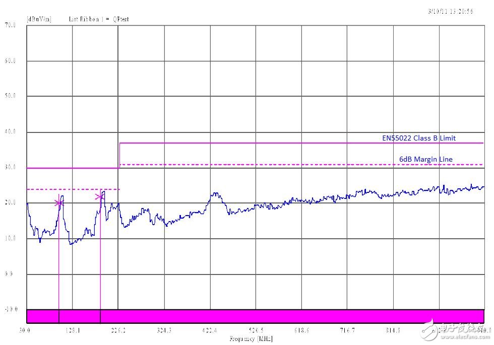 圖 4:LTM4613 以超過(guò) 6dBuV/m 的裕度,滿足 EN55022 ClassB (相當(dāng)于 CISPR11 Group 1 Class B) 的要求 (12VIN 至 5VOUT/8A)。