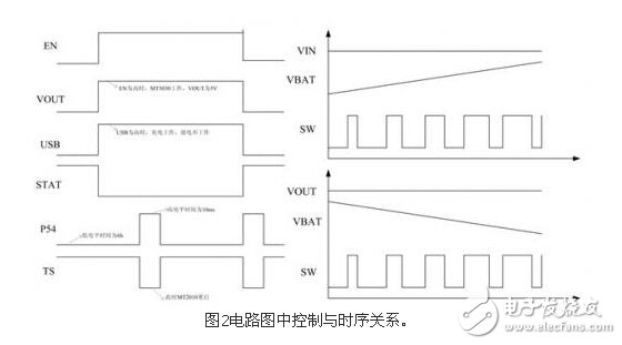 工作在第一種過程時,交流適配器或5V電源接在移動電源的Micro USB接口上,VIN為5V電壓時,R1與R2分壓產(chǎn)生USB信號送入單片機(jī),單片機(jī)檢測到USB信號后,會將輸出EN信號拉低,禁止MT5036工作。 MT2011上電后會檢測VCC的電壓,如果VCC電壓在可充電范圍內(nèi),充電芯片開始工作,對鋰電池按照浮充、快速充電、恒壓充電的過程開始充電,電感電流由SW到VCC充電。TS信號在默認(rèn)狀態(tài)下是高,如果外部電路讓TS強(qiáng)行拉低讓MT2011停止工作,D2是鉗位二極管,可以限制SW電壓最低在 -0.6V.圖2為充電和放電過程信號和輸入輸出的時序圖。