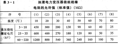 規(guī)程規(guī)定變壓器繞組的絕緣電阻允許值(標準值,MΩ)如表3—1所示。眾所皆知,比較絕緣電阻的數(shù)值時,應(yīng)換算到同一溫度。由表3—1可見,溫度每下降10℃,絕緣電阻值約增加1.5倍。根據(jù)這個原則,就可將20℃以上的各種絕緣電阻值換算至常溫時的絕緣電阻值,便可立即判斷出是否符合20℃時的絕緣電阻允許值(絕緣電阻與溫度的關(guān)系很密切,當(dāng)溫度升高時,絕緣電阻值降低,反之,絕緣電阻值增高。所以用絕緣電阻測量減去衡量變壓器的絕緣狀況時,需換算到某一指定溫度才便于比較.判斷公式為:
