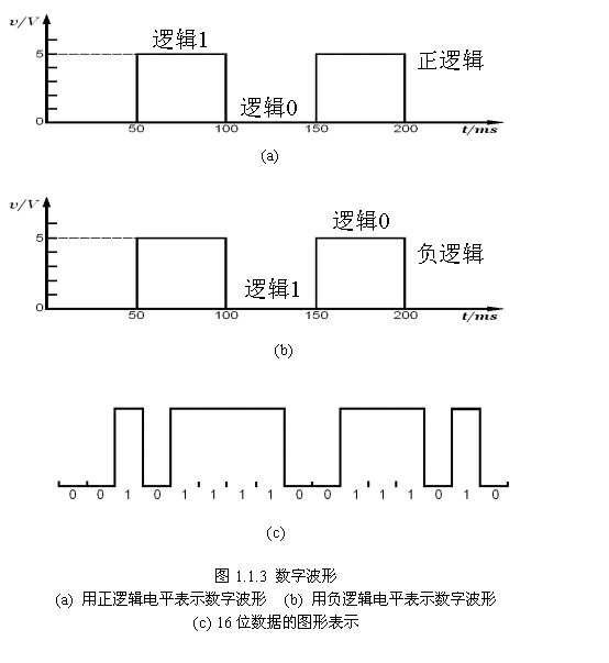 圖1.1.3表示用邏輯電平描述的數(shù)字波形,其中圖1.1.3a的邏輯0表示0V,邏輯1表示5V;圖1.1.3b的邏輯0表示5V,邏輯1表示0V;圖1.1.3c 則是一個(gè)16位長(zhǎng)數(shù)據(jù)的圖形表示。