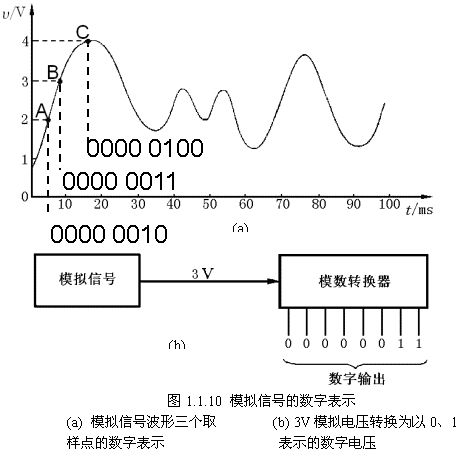 下面通過(guò)圖1.1.10的圖示來(lái)了解用數(shù)字表示模擬信號(hào)的過(guò)程: