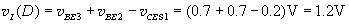 CD段:當vI的值繼續(xù)增加并超越C點,使T3飽和導通,輸出電壓迅速下降至v0≈0.2V。D點處的vI(D)值,可以根據(jù)T2、T3兩發(fā)射結(jié)電壓VF≈0.7V來估算。因此有