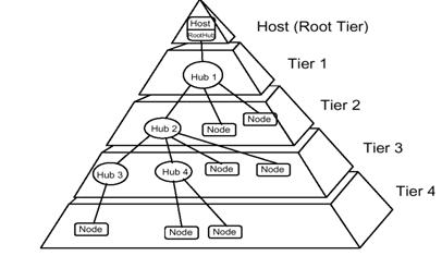 ??? USB連接了USB設(shè)備和USB主機(jī),USB的物理連接是有層次性的星型結(jié)構(gòu)。每個(gè)網(wǎng)絡(luò)集線器是在星型的中心,每條線段是點(diǎn)點(diǎn)連接。從主機(jī)到集線器或其功能部件,或從集線器到集線器或其功能部件,從圖3-1中可看出USB的拓?fù)浣Y(jié)構(gòu)。