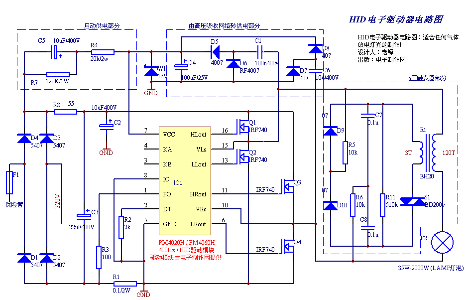控制器的輸出采用全橋逆變器。逆變器工作在195Hz的低頻,燈的平均電壓為零。橋路的驅(qū)動(dòng)由腳QOUT和QOUT輸出,它們均以50%的占空比工作,相差180°。采用IR2112驅(qū)動(dòng)高端和低端的MOSFET管。這樣的方法成本較貴,也可以低端直接驅(qū)動(dòng),高端采用一個(gè)高壓晶體管、一個(gè)上拉電阻以及正確的相位。下面是詳細(xì)的電路圖。圖2: