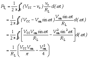 考慮到T1和T2在一個(gè)信號周期內(nèi)各導(dǎo)電約180°,且通過兩管的電流和兩管兩端的電壓vCE在數(shù)值上都分別相等(只是在時(shí)間上錯(cuò)開了半個(gè)周期)。因此,為求出總管耗,只需先求出單管的損耗就行了。設(shè)輸出電壓為vo = Vomsinwt ,則T1的管耗為