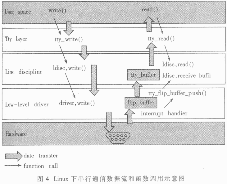 圖4 Linux下串行通信數(shù)據(jù)流和函數(shù)調(diào)用示意圖