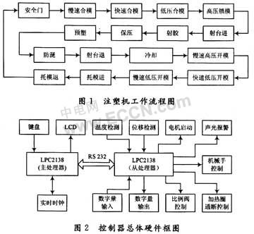 該控制器由2個(gè)控制模塊構(gòu)成,采用主從式結(jié)構(gòu)來(lái)控制注塑機(jī)的注塑過(guò)程、溫度、人機(jī)界面、通信等工作。兩個(gè)控制模塊各由一個(gè)處理器來(lái)進(jìn)行管理,處理器均采用ARM處理器LPC2138,其中一個(gè)處理器負(fù)責(zé)鍵盤(pán)及LCD顯示管理,實(shí)現(xiàn)參數(shù)在線(xiàn)設(shè)定及顯示,以提供友好的人機(jī)界面;另外一個(gè)處理器負(fù)責(zé)檢測(cè)注塑機(jī)的各路輸入情況,并實(shí)現(xiàn)對(duì)注塑的過(guò)程控制與料筒溫度控制。兩者之間采用RS 232C串行接口進(jìn)行實(shí)時(shí)通信以實(shí)現(xiàn)信息與數(shù)據(jù)的交換。系統(tǒng)硬件總體框圖如圖2所示。