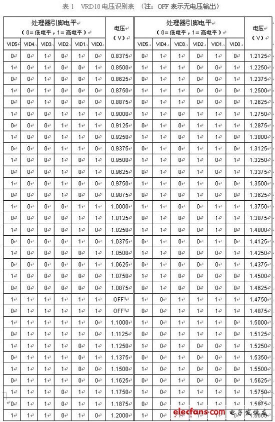 在自適應(yīng)供電系統(tǒng)中,t1是由CPU提供的VID編碼控制的。CPU的每個(gè)VID引腳有高電平和低電平兩種狀態(tài),分別代表“1”和“0”?!?”和“0”的不同組合構(gòu)成了VID編碼與輸出電壓之間的關(guān)系,見表1。由于VID編碼是不連續(xù)的,因此DC/DC轉(zhuǎn)換器實(shí)際上是一種階梯式降壓器(Step Down Regulator,簡稱SDR)。
