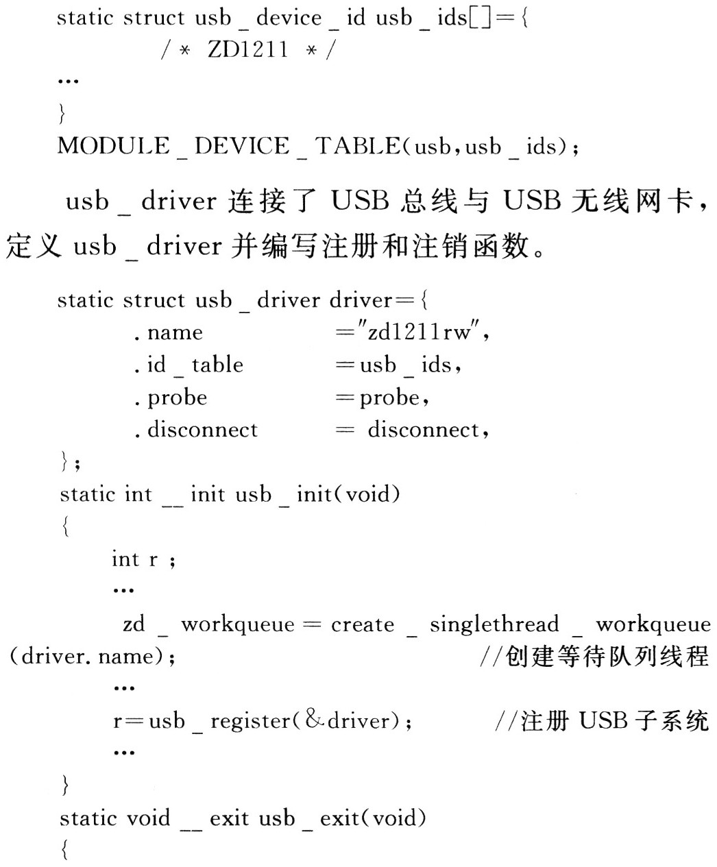 ??? 在Linux系統(tǒng)中,提供了主機(jī)側(cè)和設(shè)備側(cè)視角的USB驅(qū)動框架。從主機(jī)側(cè)角度而言,需要編寫的USB驅(qū)動程序包括主機(jī)控制器驅(qū)動和設(shè)備驅(qū)動兩大類。主機(jī)控制器驅(qū)動程序?qū)儆赨SB驅(qū)動程序的核心,這部分在Linux內(nèi)核源碼中已經(jīng)有很好的支持。本節(jié)將重點(diǎn)介紹USB無線網(wǎng)卡設(shè)備驅(qū)動的實(shí)現(xiàn)。