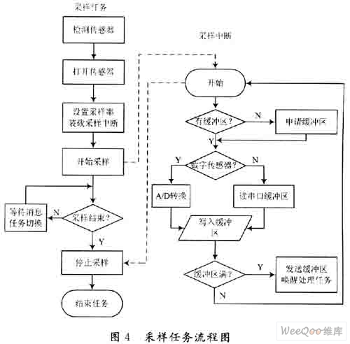 (1)采樣任務(wù),負責(zé)與傳感器端的簡單通信及實時信號的采集。由于數(shù)據(jù)采樣的實時性和準確性是采集系統(tǒng)的第一重要任務(wù),所以設(shè)置為最高優(yōu)先級。