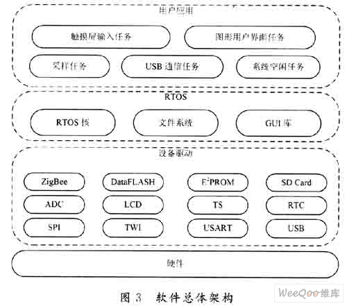 軟件分為三個層次:設(shè)備驅(qū)動層、實時操作系統(tǒng)層和用戶應(yīng)用層。