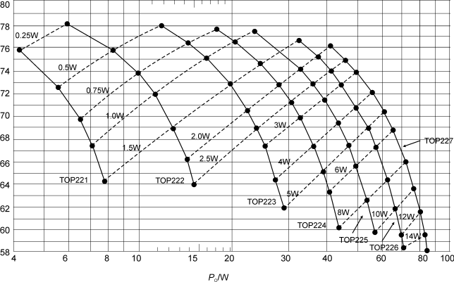 交流輸入電壓Uimax=265V。圖中的橫坐標(biāo)代表輸出功率PO,縱坐標(biāo)表示電源效率η。所畫出的7條實(shí)線分別對(duì)應(yīng)于TOP221~TOP227的電源效率,而15條虛線均為芯片功耗的等值線(下同)。