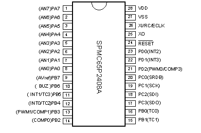 性能出色定時器和PWM信號發(fā)生器組。 SPMC75F2413A在4.5V~5.5V工作電壓范圍內(nèi)的工作速度范圍為0~24MHZ,擁有2K字SRAM和32K字閃存ROM;最多64個可編程的多功能I/O端口