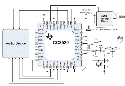 The CC8520 includes a robust built-in wireless audio transmission protocol and can control selected external audio devices. Utilizing numerous coexistence mechanisms allows the CC8520 to avoid interfering with, or being interfered by other 2.4 GHz radio systems. The CC8520, which supports 2 audio channels, is the first device in the PurePath? Wireless platform.
