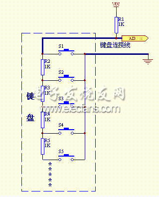 時,那線多而長很是一個不爽。下面我就說說兩線式的多按鍵電路的設(shè)計與實現(xiàn),鍵盤只需兩根導線就搞定,前提是你的單片機系統(tǒng)要有多余的一根AD口線。說到這里有人會問了,我的系統(tǒng)沒有用到模擬采集,為了弄這個鍵盤再加
