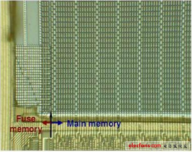 圖1-16 200倍顯微鏡下,Z86E33微控制器的熔絲沿位線緊挨著主存儲(chǔ)器