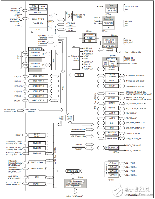 The STM32F303xB/STM32F303xC family is based on the high-performance ARM? Cortex?-M4 32-bit RISC core with FPU operating at a frequency of up to 72 MHz, and embedding a floating point unit (FPU), a memory protection unit (MPU) and an embedded trace macrocell (ETM)。 The family incorporates high-speed embedded memories (up to 256 Kbytes of Flash memory, up to 40 Kbytes of SRAM) and an extensive range of enhanced I/Os and peripherals onnected to two APB buses.