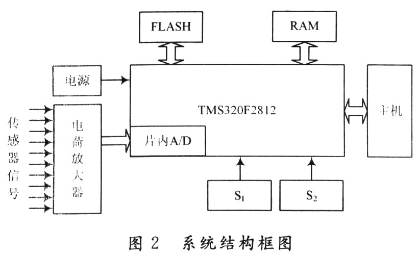 2 Signal Processor,DSP)技術(shù)取得了巨大的進(jìn)步,在當(dāng)今信號(hào)處理領(lǐng)域中已占據(jù)了主導(dǎo)地位。擦傷振動(dòng)檢測(cè)系統(tǒng)采用振動(dòng)加速度法進(jìn)行擦傷檢測(cè),利用壓電式振動(dòng)加速度傳感器將加速度信號(hào)轉(zhuǎn)換成電荷量,再通過(guò)電荷放大器將電荷量轉(zhuǎn)換成電壓信號(hào)值傳