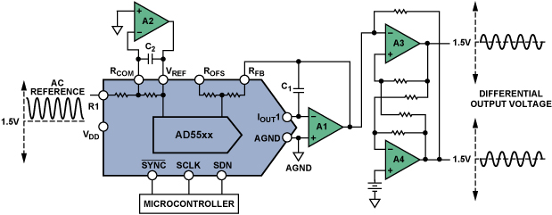 要產(chǎn)生正電壓輸出,可以使用一個外部反相運(yùn)算放大器電路來另外反轉(zhuǎn)輸入或輸出。 一些乘法DAC內(nèi)置非專用匹配電阻(具有跟蹤溫度系數(shù)),因此只需額外連接一個運(yùn)算放大器(圖 4 中的 A2)即可獲得正輸出,這個額外的運(yùn)算放大器可以是一個雙通道器件內(nèi)的配套運(yùn)算放大器。